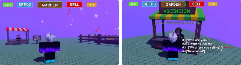 Garden Coin Shop trong Grow a Garden có thể tìm thấy bằng cách vào nút Bán ( Sell ) và ở bên phỉa màn hình, góc phía góc sản bạn sẽ thấy Garden Ascension, hãy đi bộ đến và nhấn phím E, rồi chọn vật phẩm muốn bán, sau đó lấy Garden Coin Shop