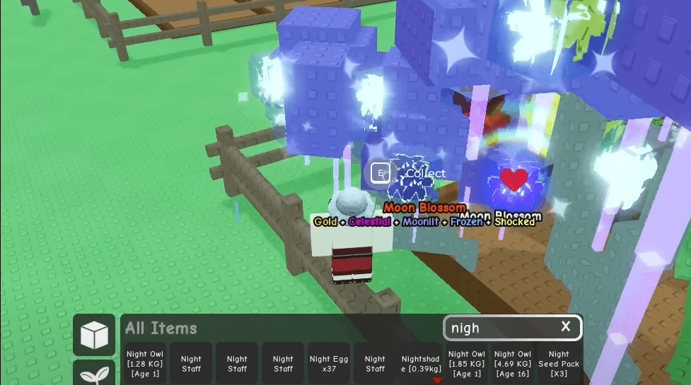 - Trang bị cố định: giữ một Lightning Rod (cho Shocked), một Star Caller (cho Celestial vào ban đêm), và một Night Staff (cho Moonlit) trên mảnh đất. Các loại máy tưới nước Basic/Advanced/Godly/Master giúp tăng trọng lượng và tỷ lệ ra biến thể.