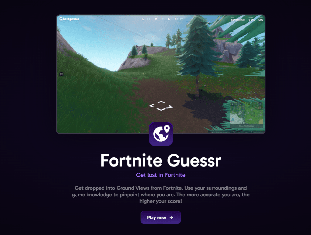 Fortnite Geoguessr là webgame mô phỏng lại trò Geoguessr nhưng giới hạn là những địa điểm trong game Fortnite , Theo đó thử thách người chơi với những ảnh chụp vị trí trong game, người chơi sẽ dự đoán ” vị trí đó ở đâu” trong game. Nó là một cách thủ thách bản thân và mức độ yêu thích của bạn với game, đặc biệt những người yêu thích Fortnite và có trí nhớ tốt.