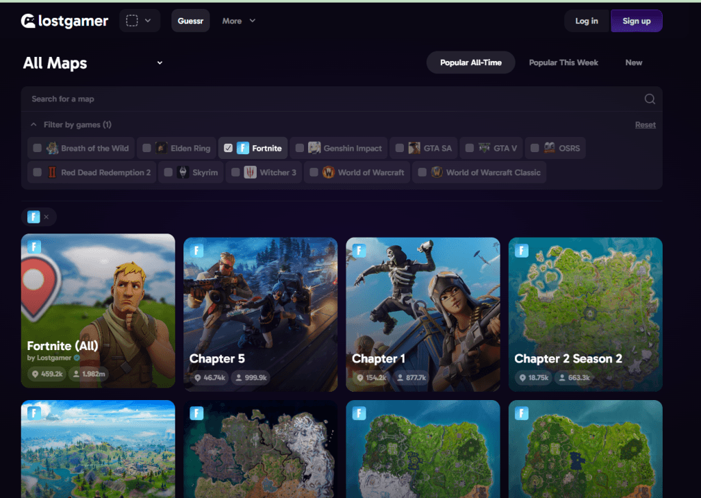 Bước 2: Bạn có thể chọn maps theo phần đang chơi hoặc chọn tất cả các map với Fortnite(all) sẽ co bạn với 459.000 địa điểm