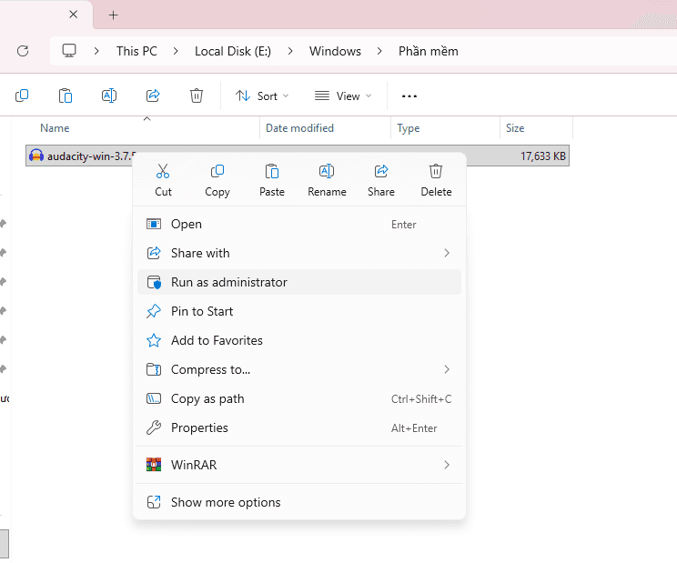 Sau khi Download về, bạn sẽ có một file tên là audacity-win-x.x.x-64bit Hãy Click chuột phải vào file đó chọn Run as administrator ( cài đặt với quyền quản trị cao nhất trên máy tính của bạn )