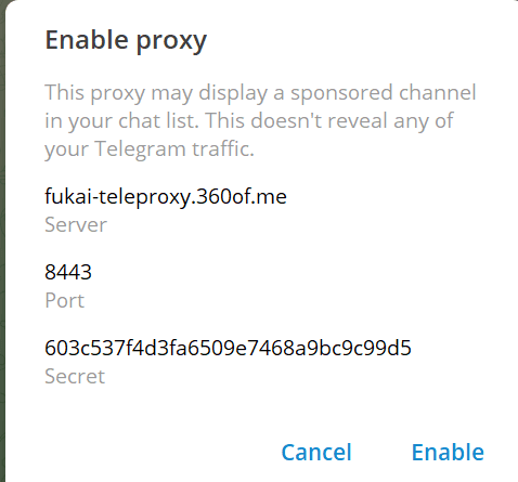 tg://proxy?server=fukai-teleproxy.360of.me&port=8443&secret=603c537f4d3fa6509e7468a9bc9c99d5