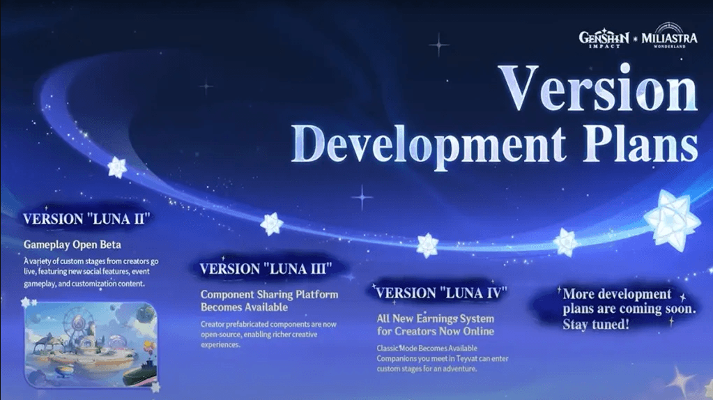 Phiên bản Genshin Impact Luna II sẽ lần đầu tiên giới thiệu Miliastra Wonderland đến với người chơi. Chế độ chơi mới này sẽ cho phép người chơi tạo ra các mini-game mới và chơi chúng cùng bạn bè. Nhưng đó chưa phải là tất cả, vì hệ thống sáng tạo này còn đi kèm với cơ chế kiếm tiền. Nó sẽ thay đổi hoàn toàn trải nghiệm Genshin Impact mãi mãi, vì vậy cộng đồng người chơi đang vô cùng hào hứng chờ đợi ngày ra mắt.