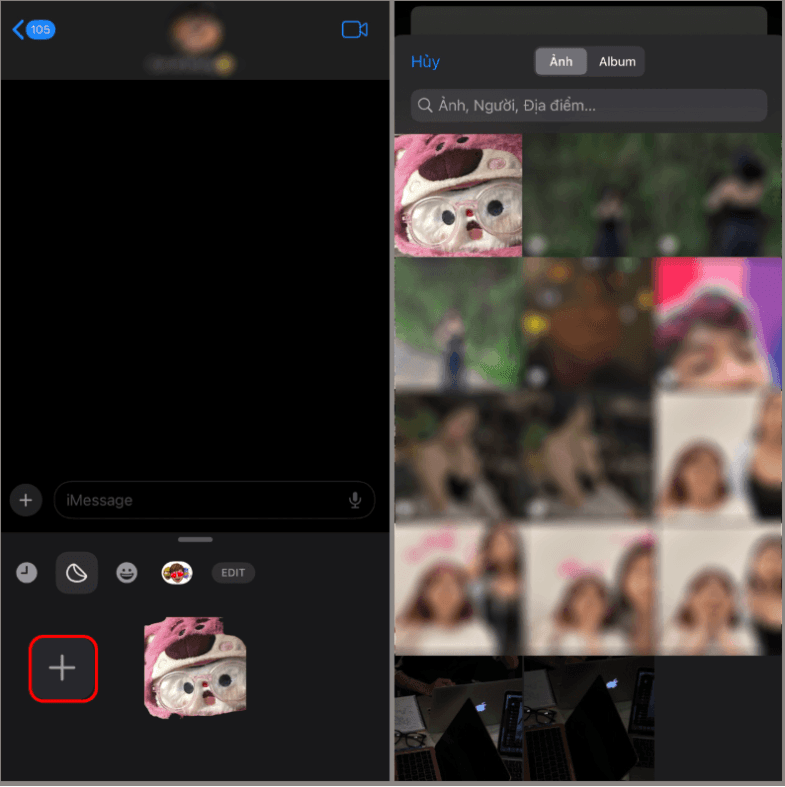 Bước 3: Mở mục tin nhắn trên iPhone, > ấn vào dấu + và chọn mục Dán Nhãn
